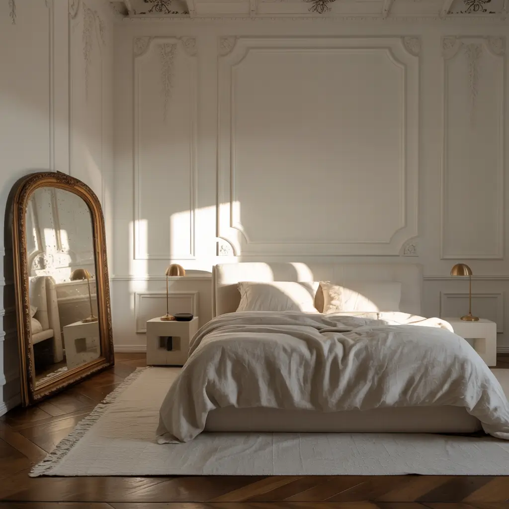 - The Bed: Choose a bed with a classic shape, like a sleigh bed or a wingback headboard, but opt for one with simple, clean upholstery and no extra tufting or ornamentation.