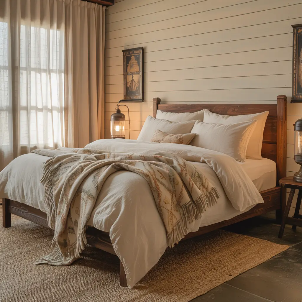 • The Textiles: This is where the cozy comes in. Layer the bed with a soft quilt, a chunky knit throw, and maybe some pillows made from vintage grain sack fabric.