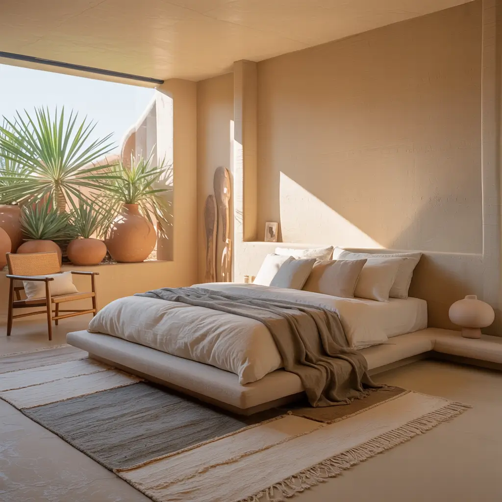 • The Furniture: Very minimal and low-profile. A simple platform bed, maybe made of concrete or a light, sun-bleached wood. Furniture should have clean, geometric shapes.