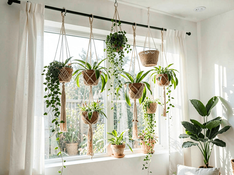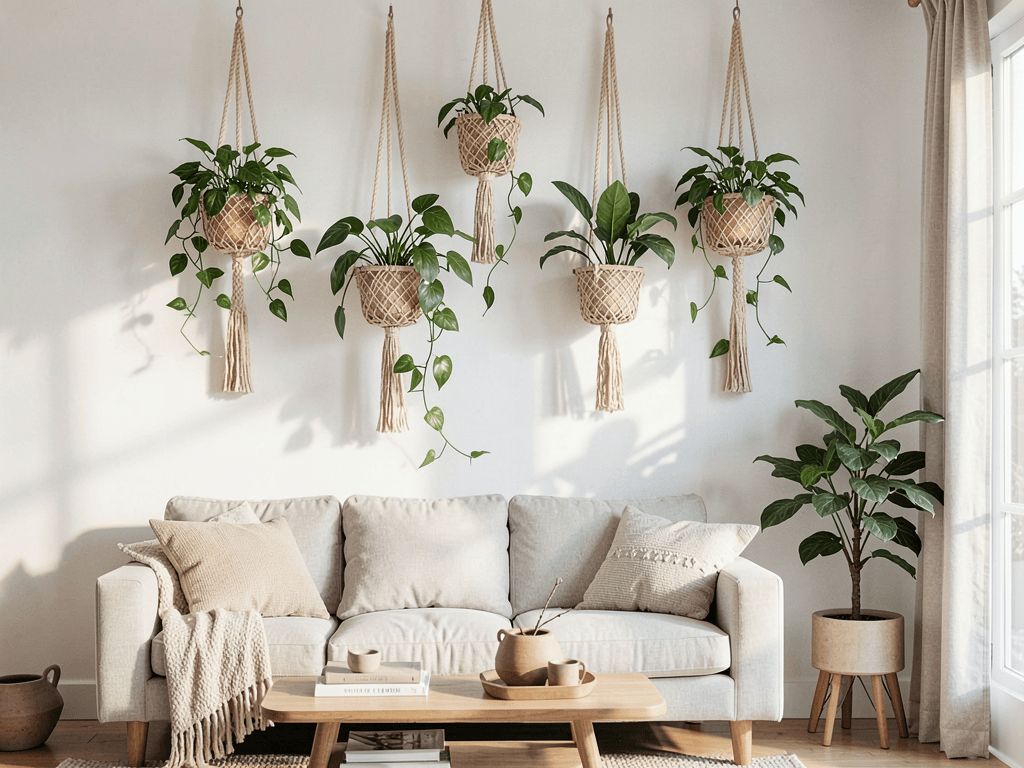 Vary your hanging heights to create visual flow. I hang mine in odd-numbered groups (usually three) at different levels – it creates movement and prevents that uniform “plant shop” look. The lowest plant should hang at eye level or slightly above for best viewing.