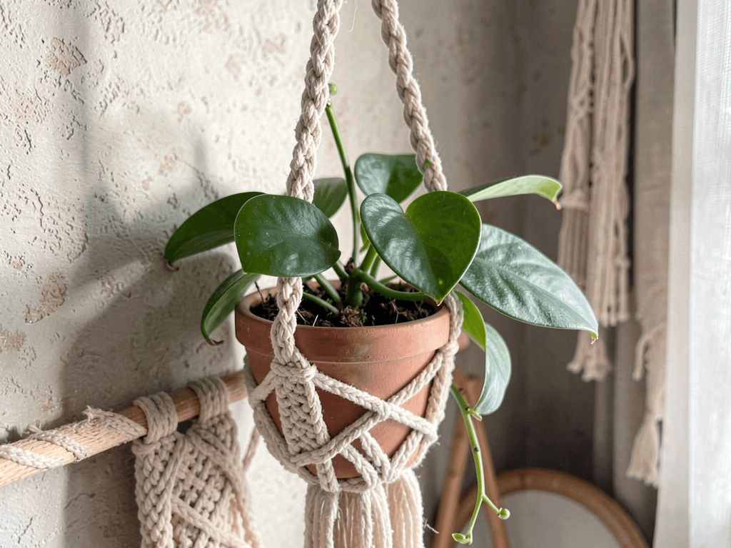 Choose cord material based on your decor. Natural jute works for rustic spaces, white cotton for modern minimalism, and colored cord for playful pops. The planter should complement, not compete with the hanger – simple pots let elaborate macrame shine.