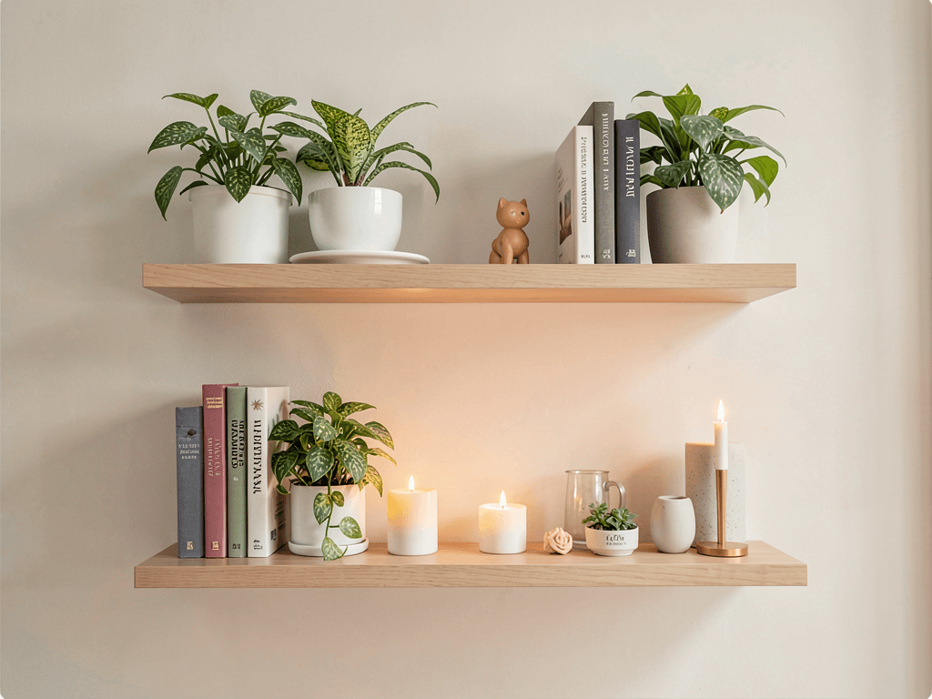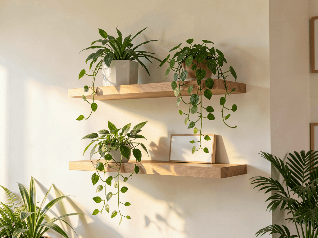 Use quality brackets hidden within the shelf for that true floating appearance. Level everything meticulously – crooked floating shelves with plants look like a disaster waiting to happen. I use a laser level now after learning this lesson the hard way.