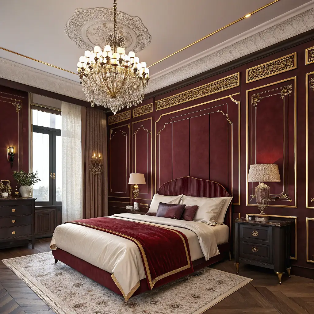 10. Burgundy and Gold Elegant Bedroom