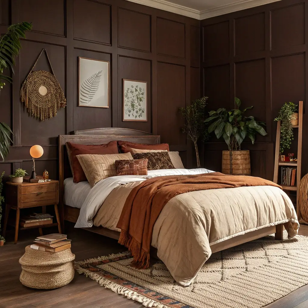 Chocolate brown is having a moment, and honestly, it’s about time. This moody color wraps your bedroom in warmth without the commitment of black or drama of jewel tones.