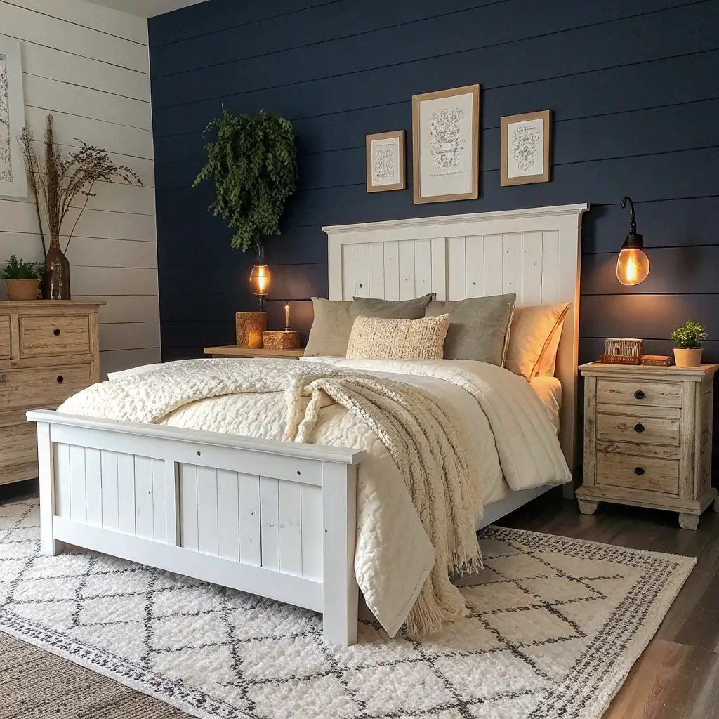 Navy blue brings sophistication to farmhouse style, and deep navy creates moody bedrooms that feel both cozy and refined. It’s the perfect color for those who want drama without committing to black.