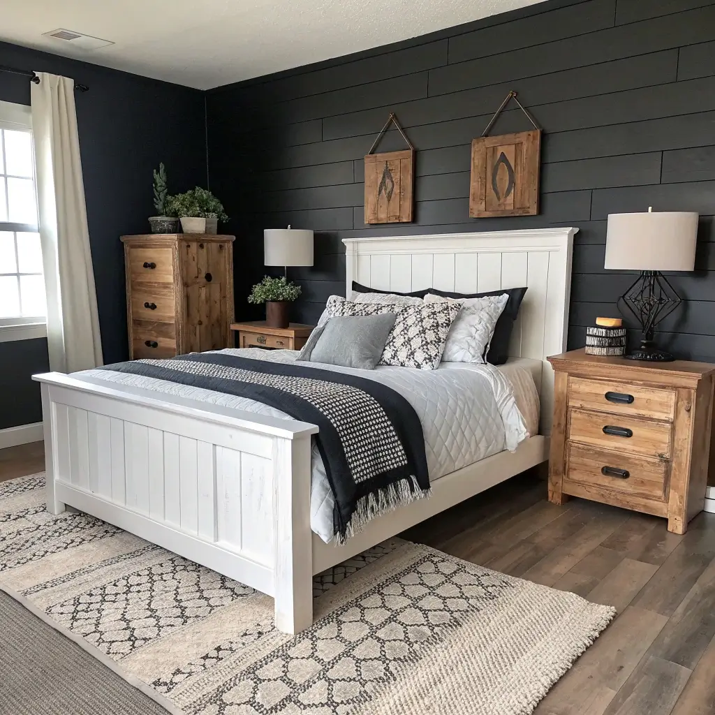 Black and white creates maximum drama, and this high-contrast approach brings graphic sophistication to farmhouse bedrooms. It’s bold, it’s decisive, and it definitely makes a statement.