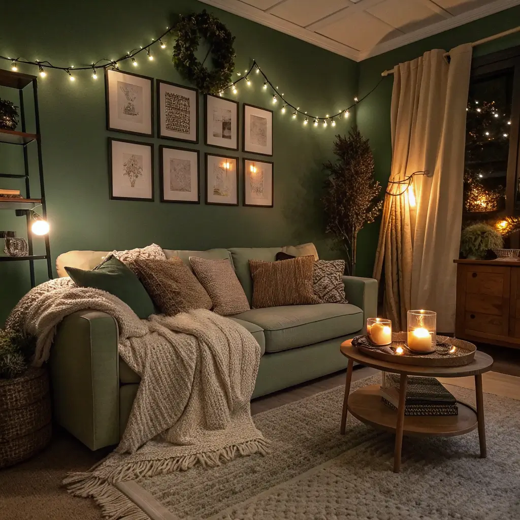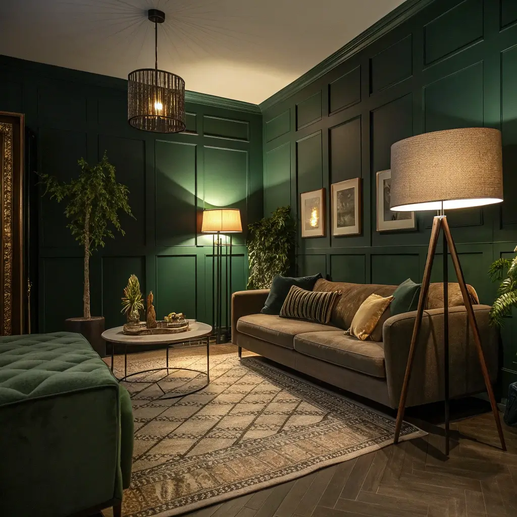 2. Forest Green Living Room with Layered Ambient Lighting