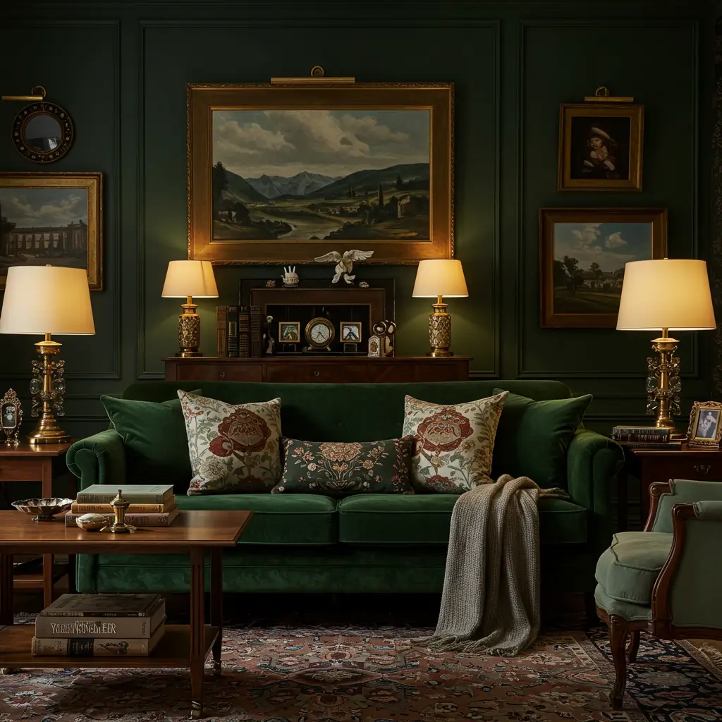 5. Vintage-Inspired Green Living Room with Velvet Textures