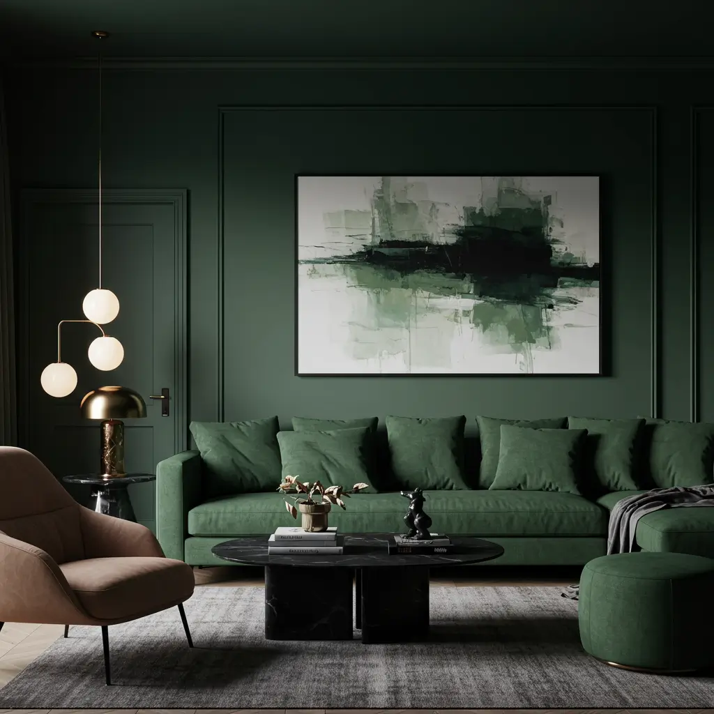 8. Shadowy Green Living Room with Statement Wall Art