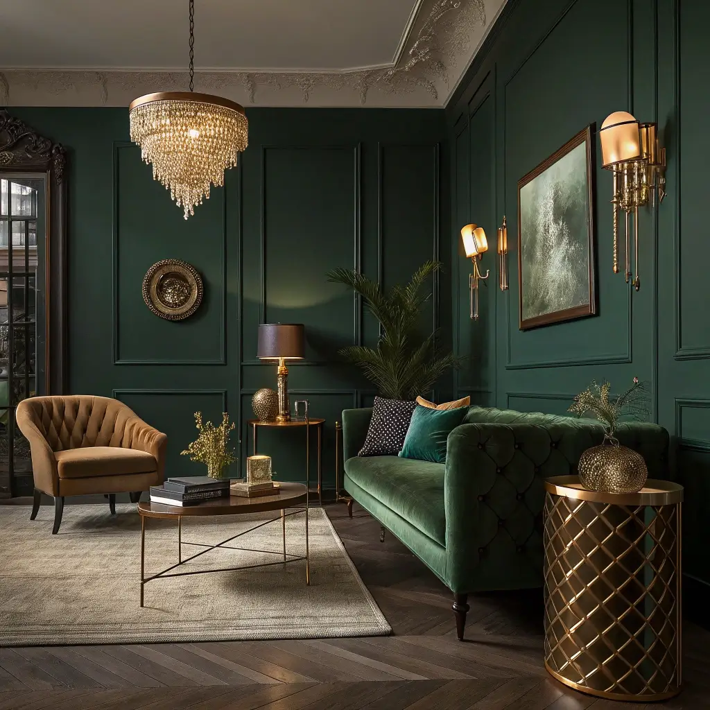 7. Moody Green and Gold Luxury Living Space