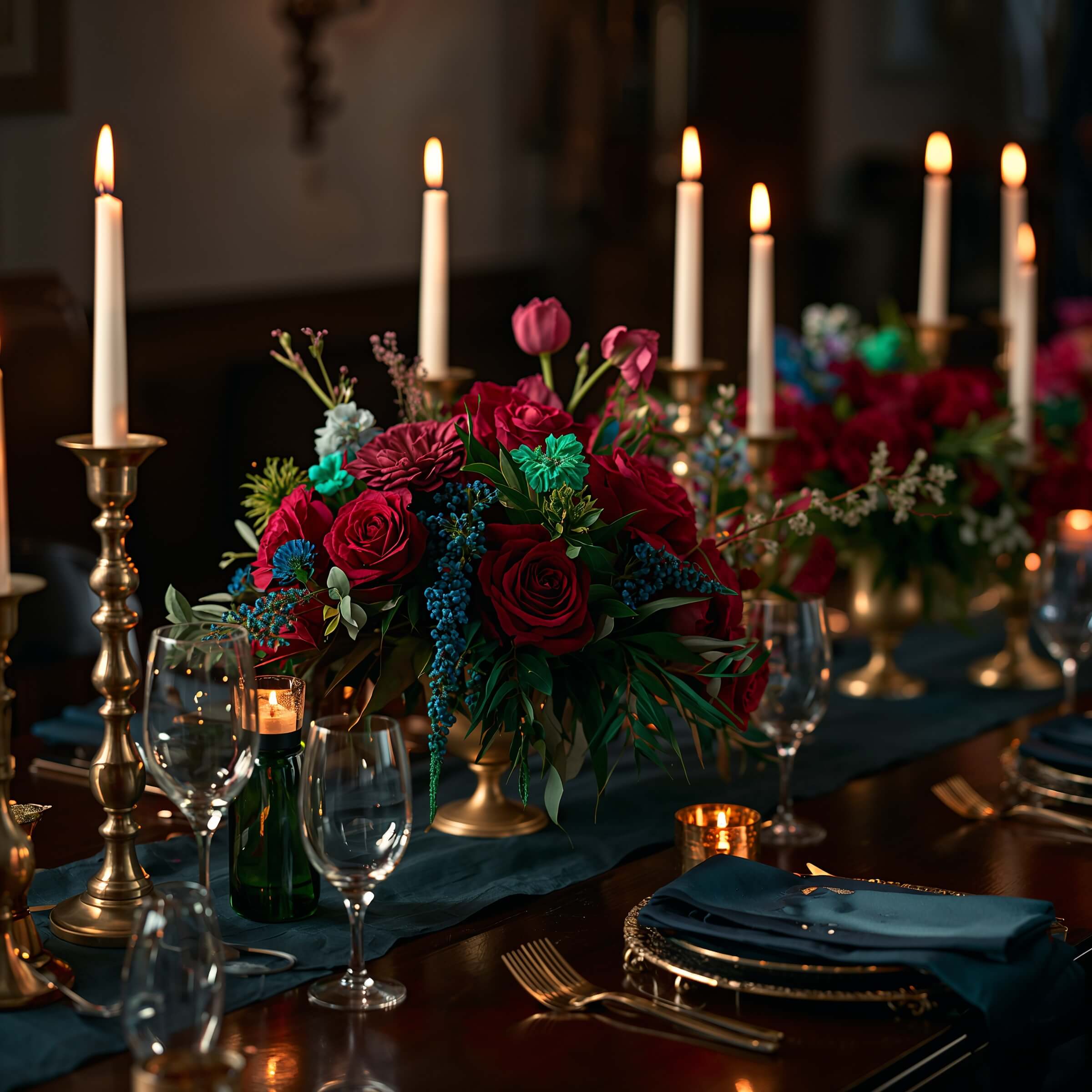 The key here lies in layering textures that beg to be touched. Start with velvet table runners in rich colors like emerald green, midnight blue, or oxblood red. Then add vintage brass candlesticks of varying heights – and I mean really go for it with the candles. We’re talking at least 5-7 candles per table, creating pools of flickering light that make everyone look like they’re in a Rembrandt painting.