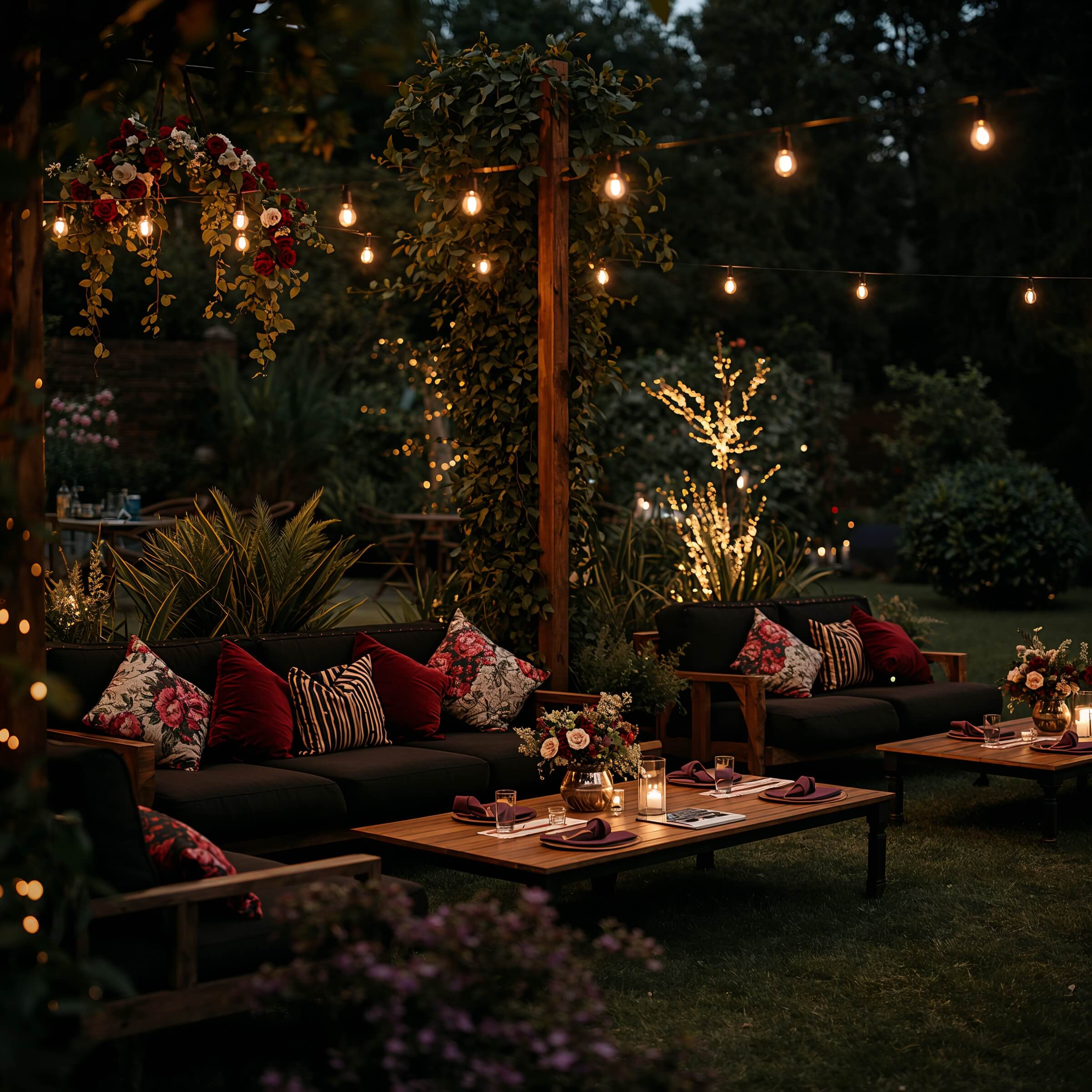 Here’s where things get really fun. Creating twilight garden lounge areas gives your guests cozy spots to escape and chat while maintaining that moody romantic vibe throughout your venue.