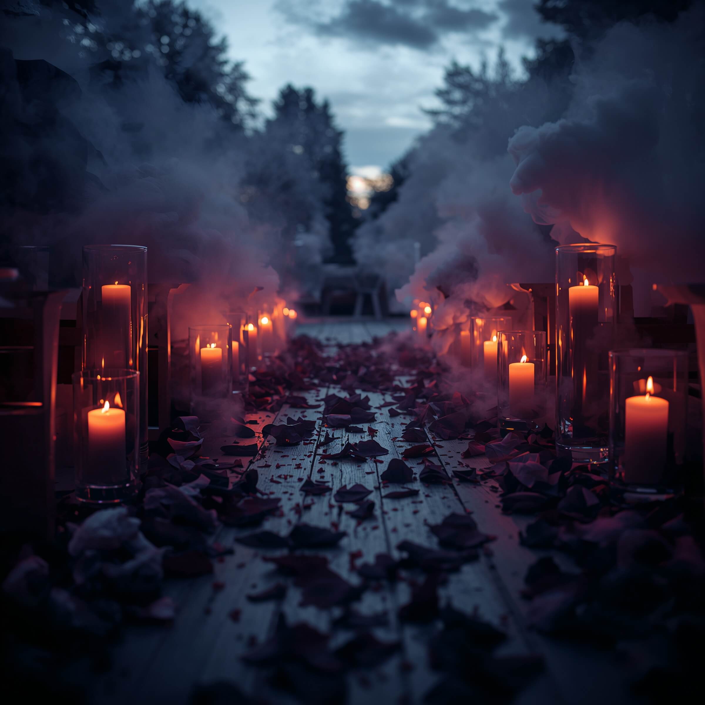 Line your aisle with clusters of pillar candles at varying heights, placed in hurricane glasses or lanterns for safety (because nobody wants the fire department as wedding crashers). The “smoky” effect comes from using candles in deep, moody colors – think burgundy, plum, or even black – mixed with traditional ivory ones.
