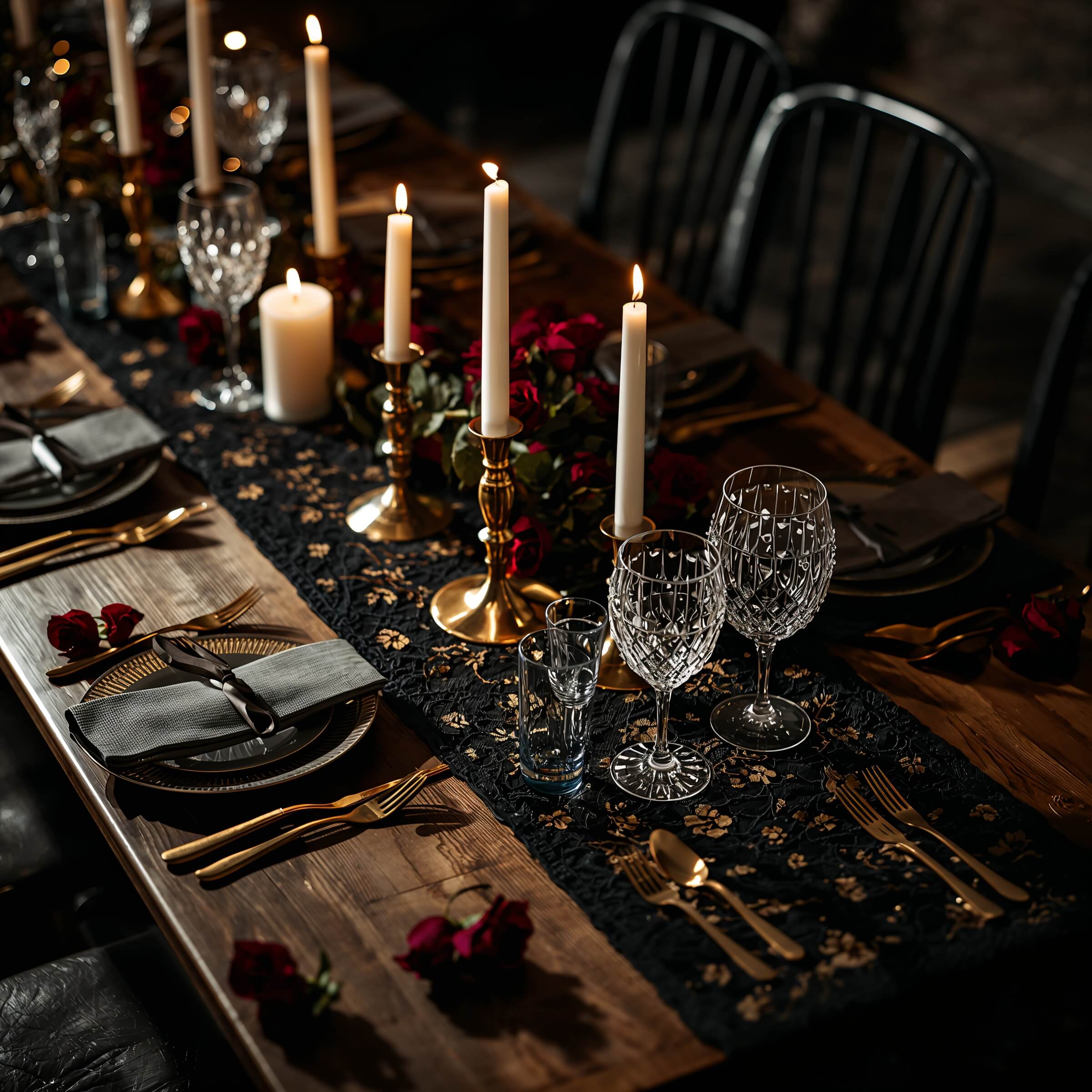 The key lies in the quality and pattern of the lace. Look for intricate, delicate patterns rather than chunky gothic designs. When you layer black lace over burgundy, deep purple, or emerald green tablecloths, it creates this gorgeous textural element that catches candlelight beautifully.