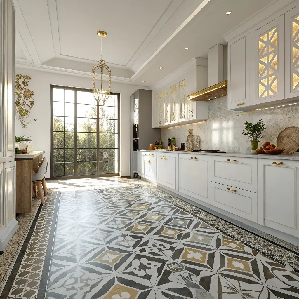 Moroccan geometric patterns underfoot create foundations that anchor entire kitchen designs. These floors become conversations pieces guests can’t ignore.
