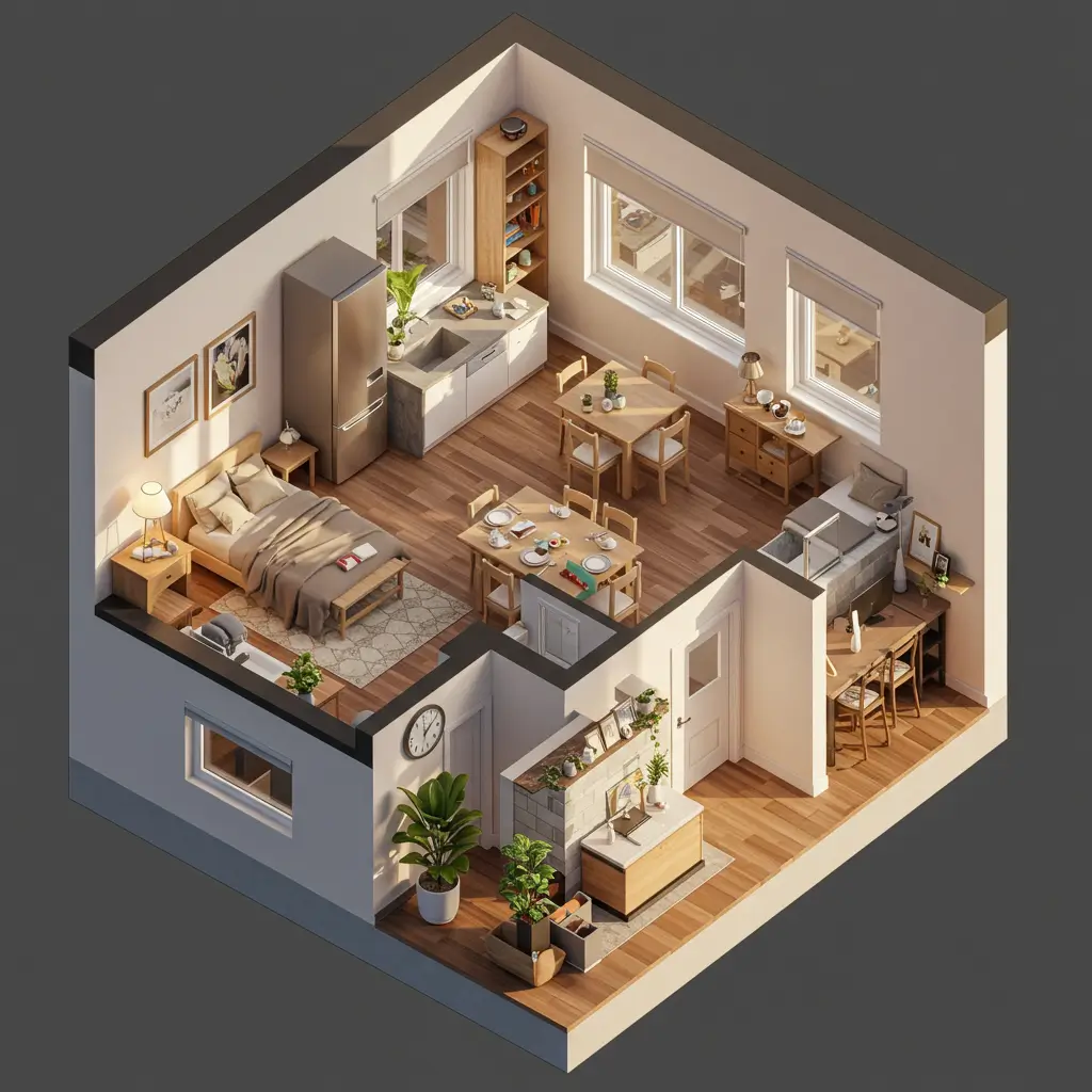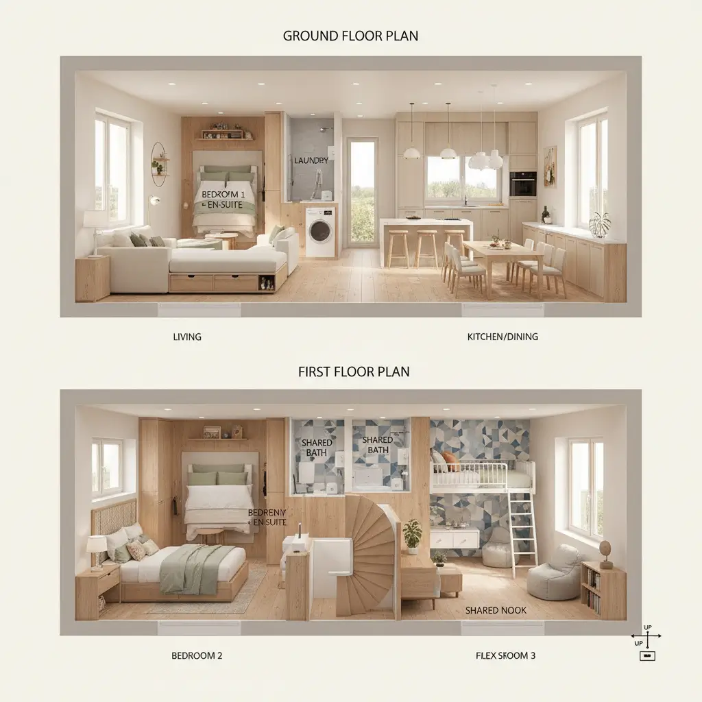 The challenge with compact plans involves maintaining privacy when everyone’s living in close proximity. Smart designs use pocket doors, sound-insulating materials, and strategic furniture placement to create separation without walls.