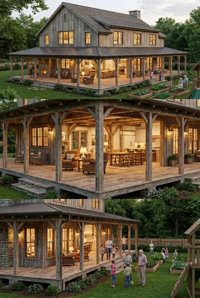 Farmhouse plans excel at connecting interior spaces with outdoor living. Covered porches provide three-season living space. French doors open to patios. Kitchen gardens bring food production into daily life. These connections give everyone space to spread out despite living together.