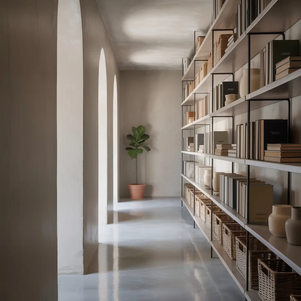 I installed floor-to-ceiling shelving on one side, but here’s the kicker: I kept everything super shallow (6 inches deep max). This way, I get storage without feeling like the walls are closing in on me. The top shelves hold seasonal stuff, middle shelves display pretty baskets with everyday items, and the bottom has hooks for bags and coats.