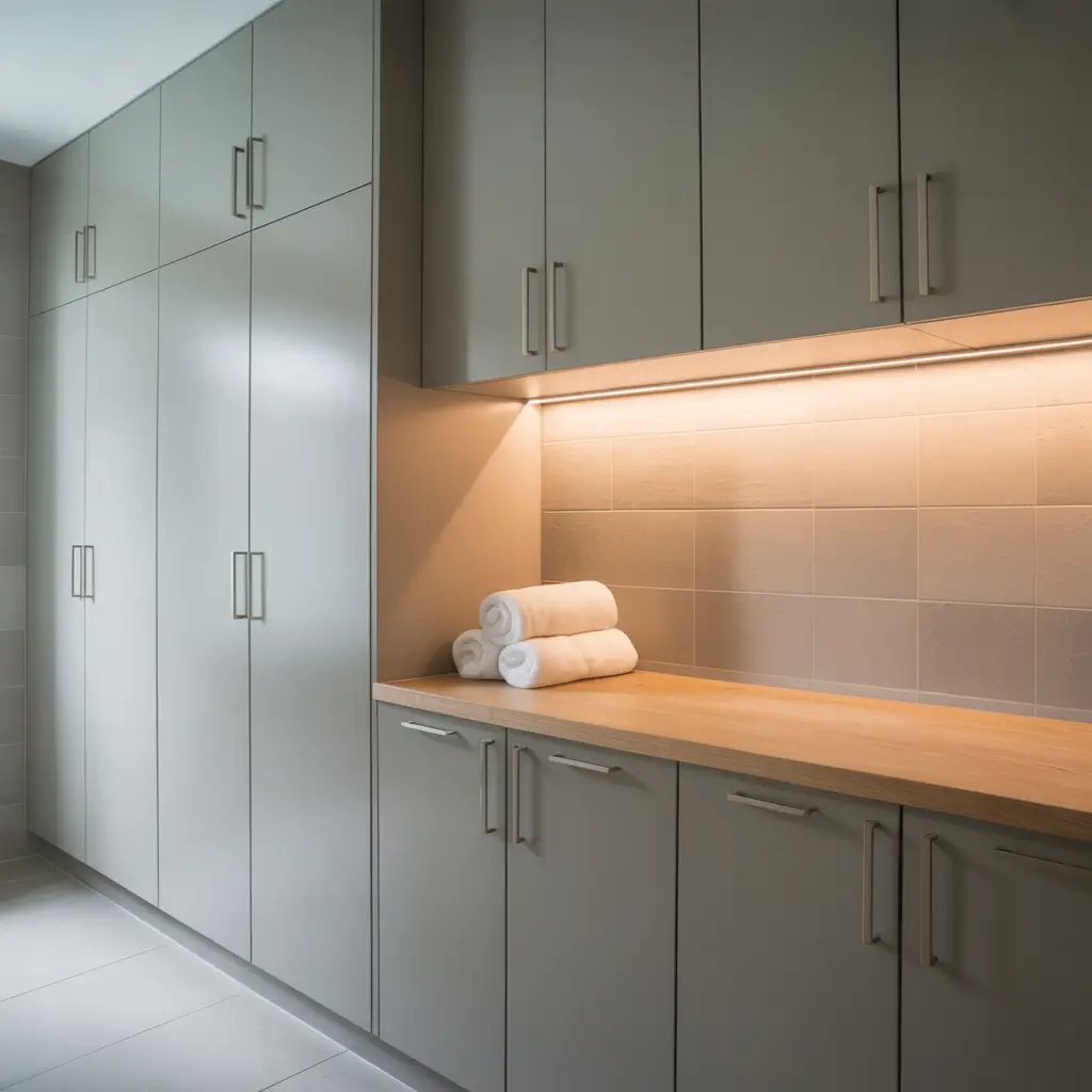 Here’s where people mess up – they buy regular cabinets and wonder why their laundry room feels cramped. Slimline cabinets (typically 12-15 inches deep instead of 24) give you storage without the bulk.
