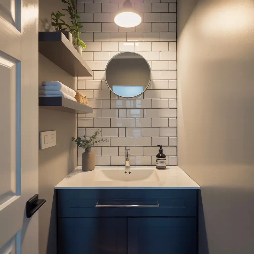 The trick is using navy strategically. A navy vanity grounds the space and creates a focal point, drawing eyes to one strong element instead of bouncing around a tiny room. Pair it with a large mirror, good lighting, and keep everything else light and bright.