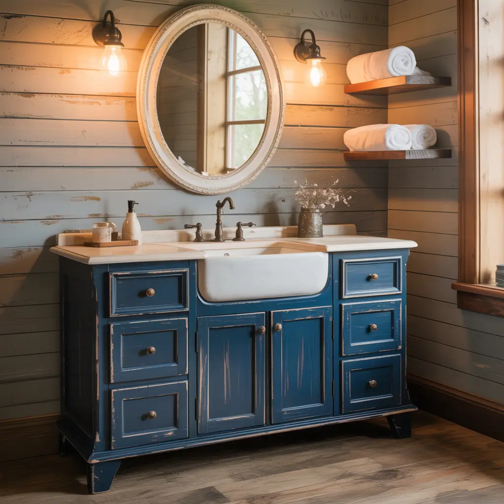 I recently helped my friend design a farmhouse bathroom with a navy vanity, and we went full rustic – distressed navy paint, oil-rubbed bronze hardware, and a thick butcher block countertop. The navy prevented it from looking too country, while the rustic elements kept it from feeling too formal. Perfect balance.