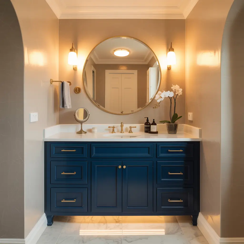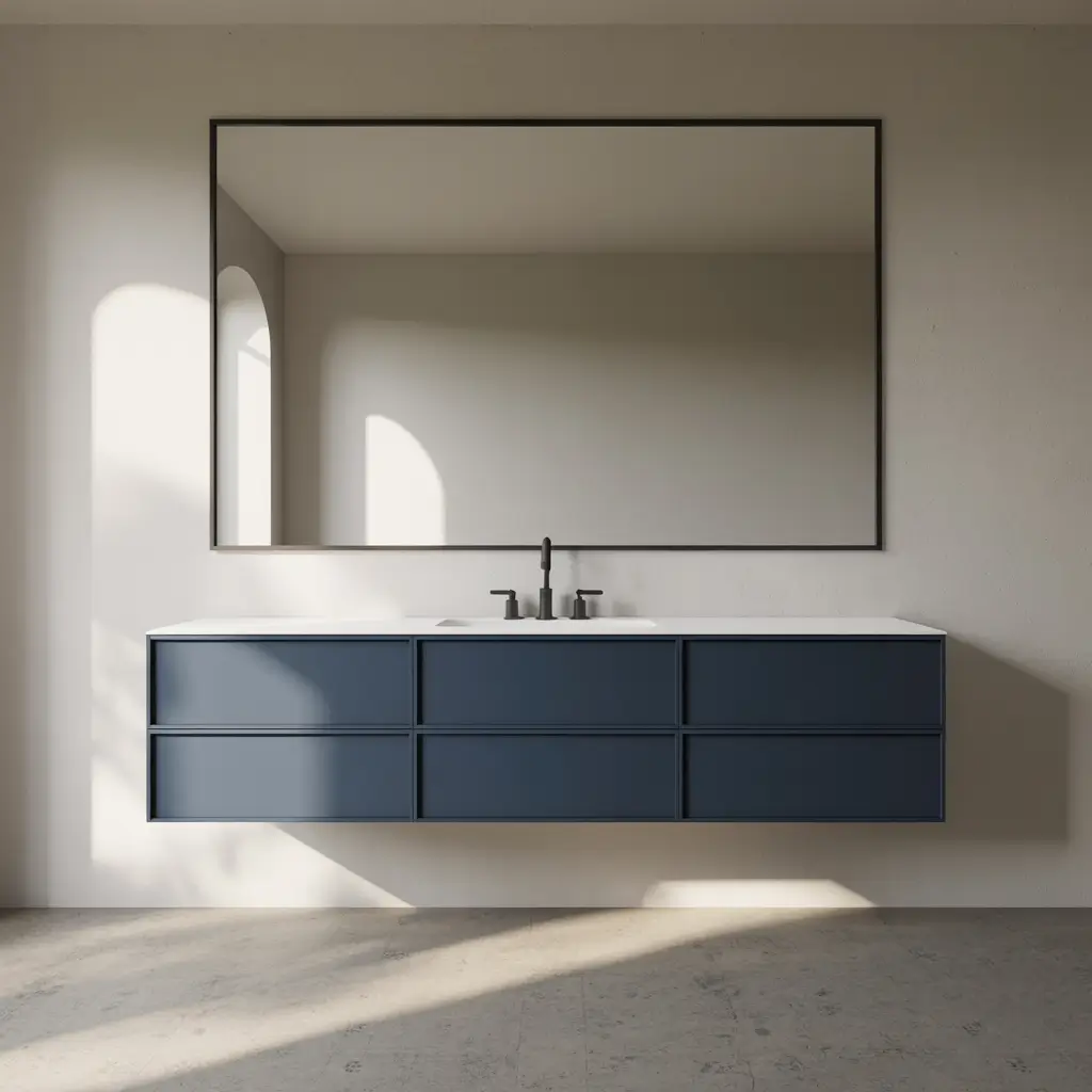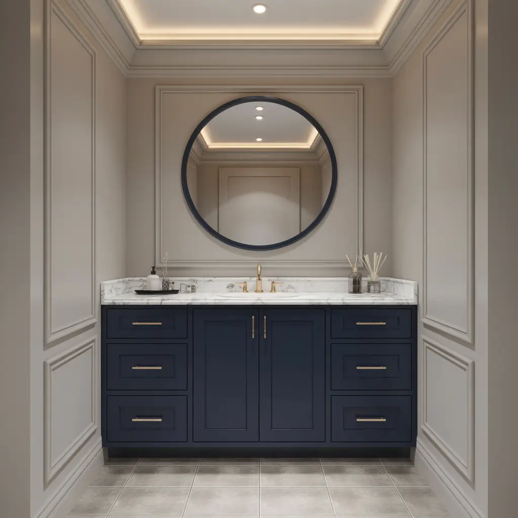 Minimalism and navy might seem contradictory – isn’t navy kind of a statement? But minimalist navy vanities prove that simple doesn’t mean boring. The color itself becomes the design element, eliminating the need for excessive decoration.