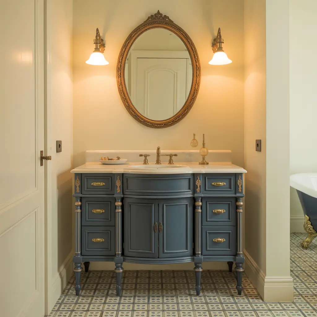 Vintage navy vanities bring this incredible old-world charm that makes new bathrooms feel like they have history. I converted a 1950s dresser into a navy vanity, and the combination of vintage bones and bold navy created something totally unique.