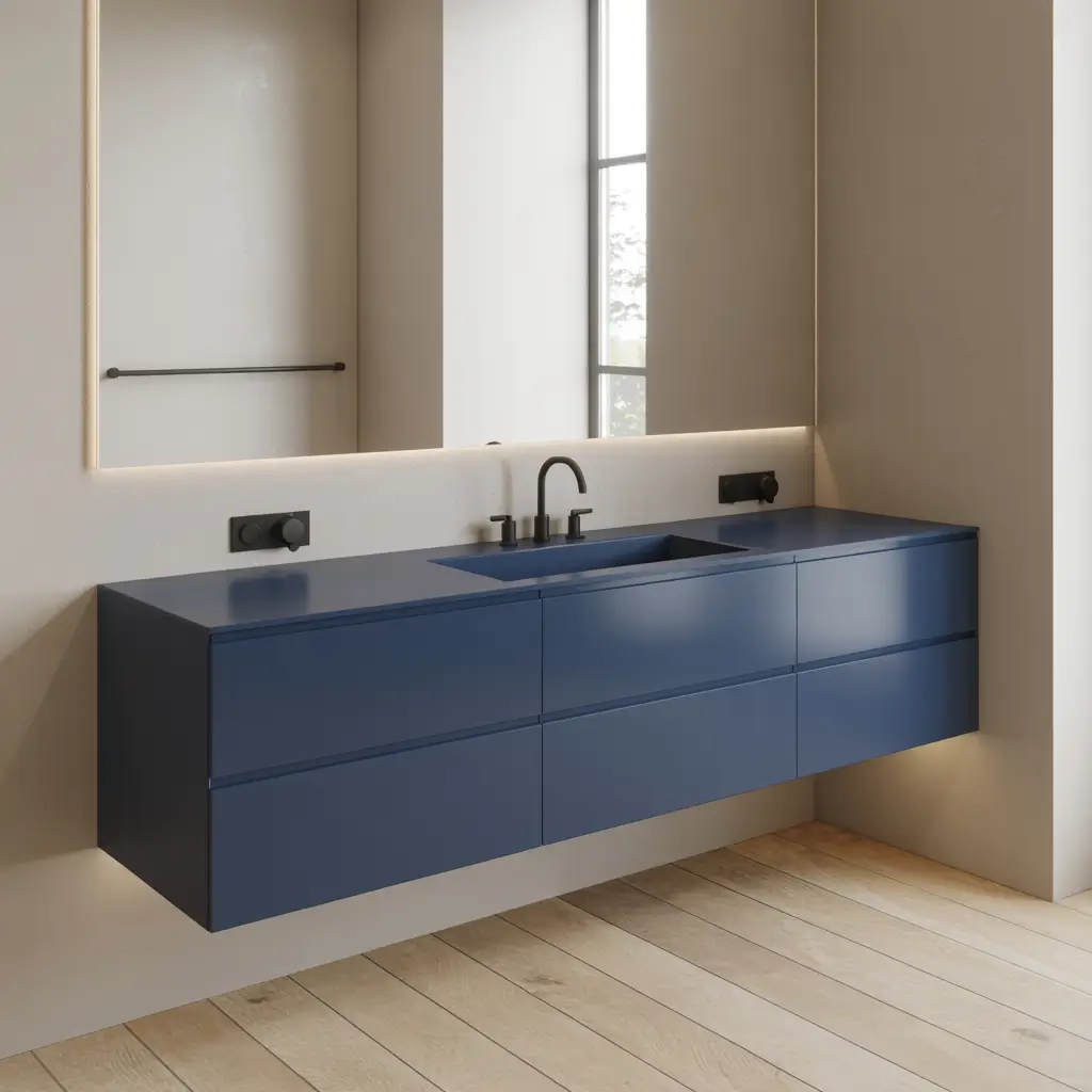 Floating vanities in navy blue create this amazing visual trick where the bold color seems to hover, making bathrooms feel larger and more open. I installed one in my condo bathroom, and the floating effect combined with the navy creates serious design impact.