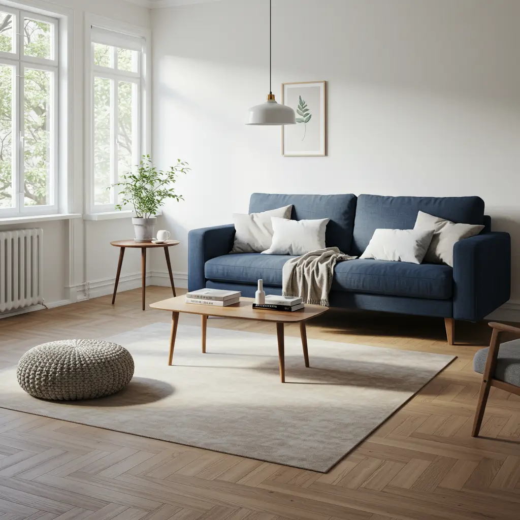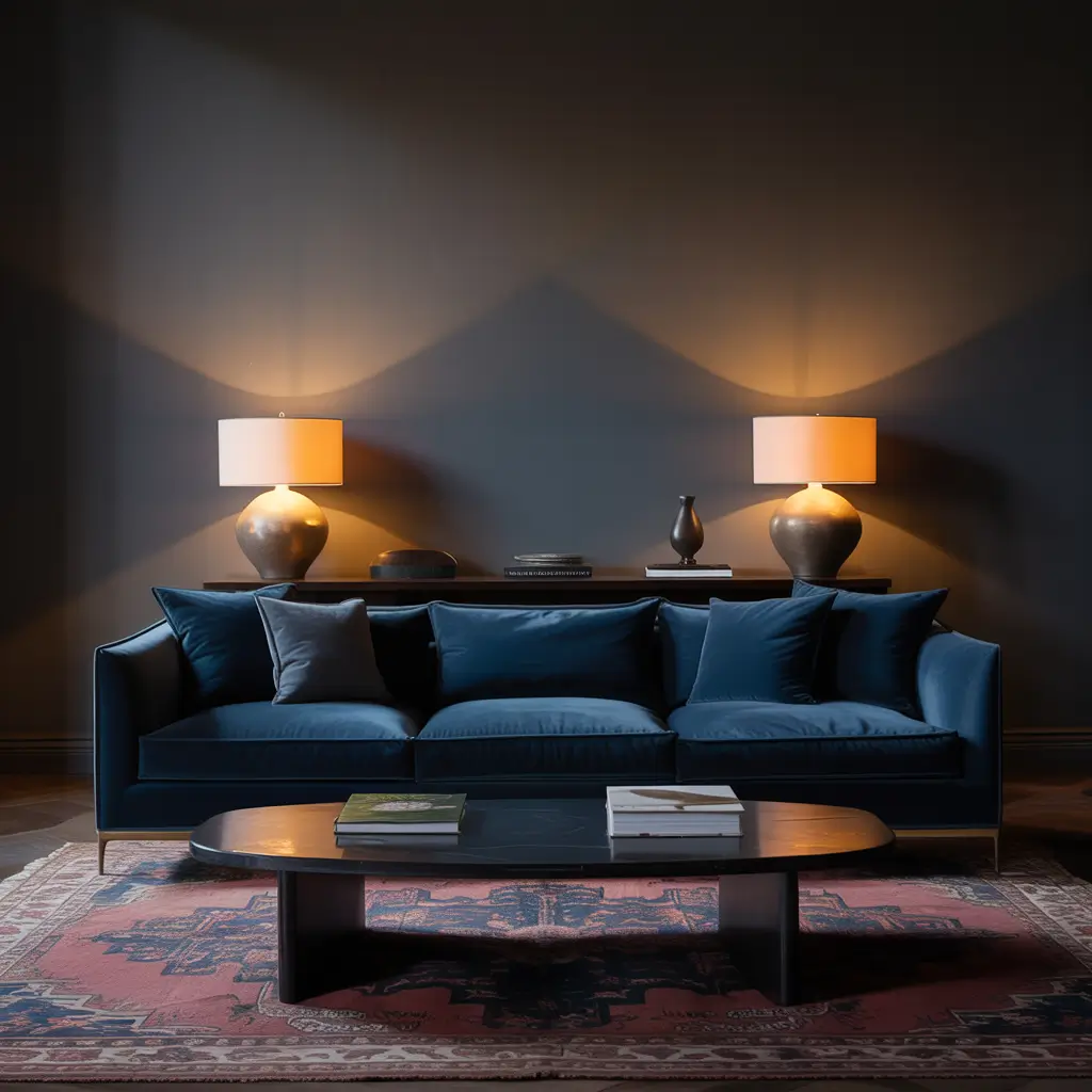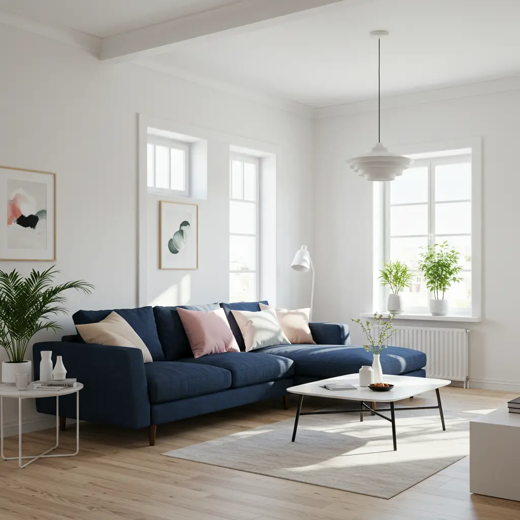 The key to cozy minimalism with a navy couch is embracing negative space without sacrificing comfort. You want enough breathing room to let that beautiful blue sofa stand out, but enough textural elements to keep the space from feeling empty or unwelcoming.