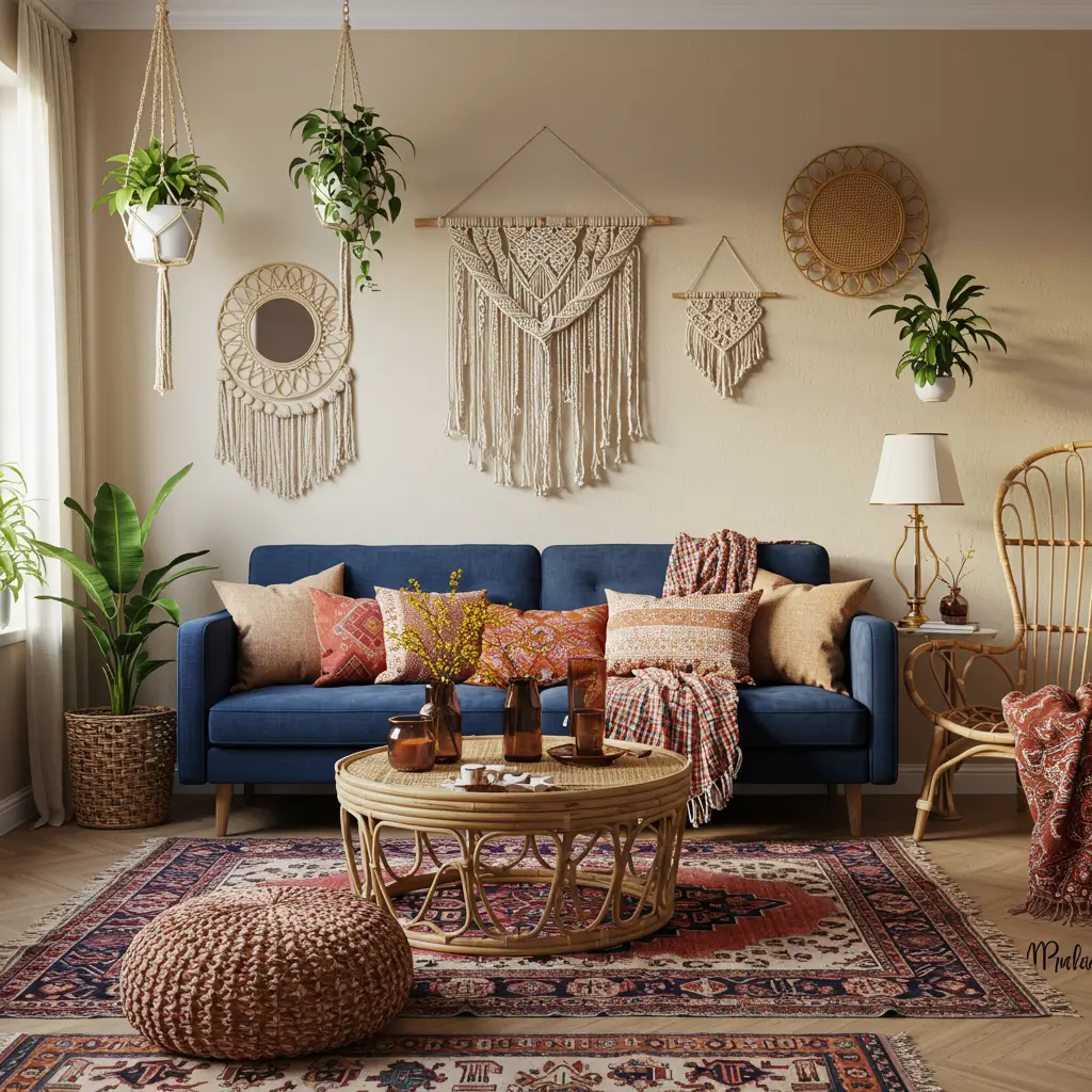 • Natural materials like rattan, macramé, and unfinished woods