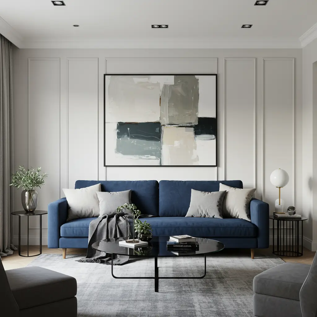 The beauty of this pairing lies in the balance – your bold navy piece provides depth and anchor, while the neutrals add warmth and softness that keep the space from feeling too stark or formal.