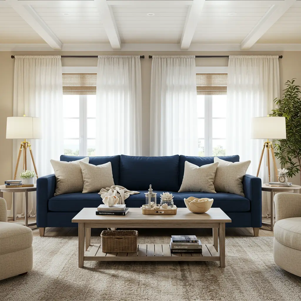 Have you ever noticed how the best beach houses never actually have obvious “beach decor”? They capture that coastal feeling through texture, color, and light rather than seashell collections and anchor motifs. Your navy couch provides the perfect sophisticated anchor (pun definitely intended) for creating that elevated coastal vibe.