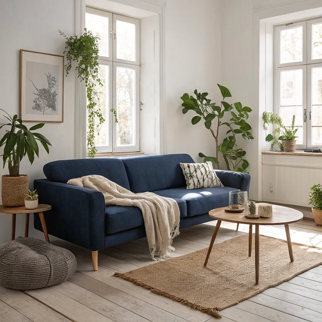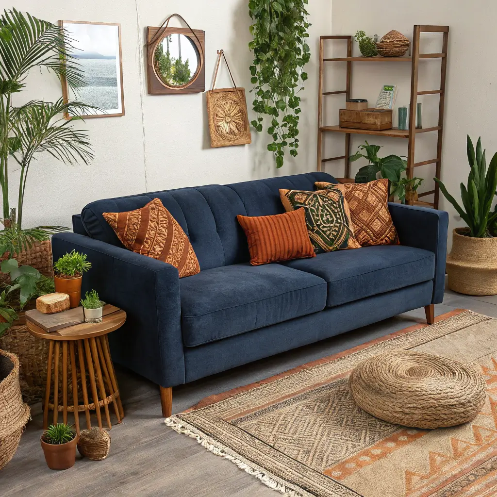 Bohemian style celebrates color, pattern, and that collected-over-time feeling that makes spaces feel truly personal. Your navy couch provides the perfect grounding element that prevents all those beautiful boho pieces from feeling chaotic or overwhelming.