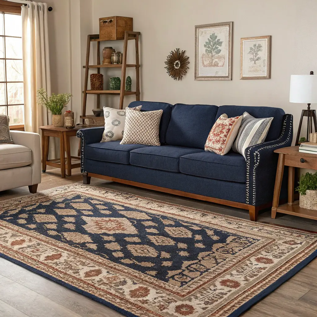 The key to successful rug pairings is understanding how pattern scale affects your space. Large-scale patterns tend to make rooms feel more spacious, while smaller, denser patterns create intimacy and coziness. Your navy couch remains the constant while the rug determines much of the room’s overall feeling.