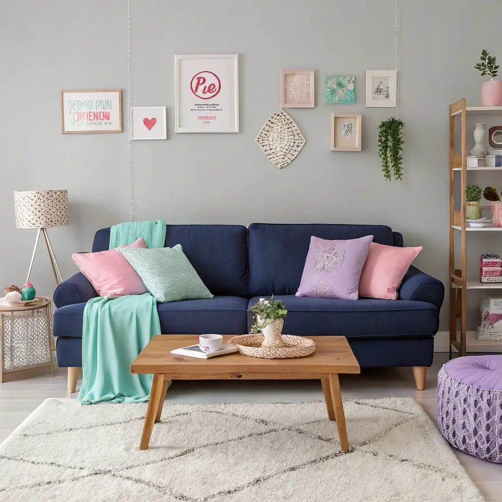 Here’s a combination that feels both fresh and sophisticated – navy couches with strategic pastel accents create this incredible modern elegance with just enough playfulness to keep things interesting. This approach works especially well when you want a room that feels grown-up but not stuffy or severe.