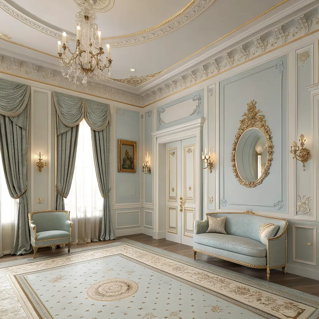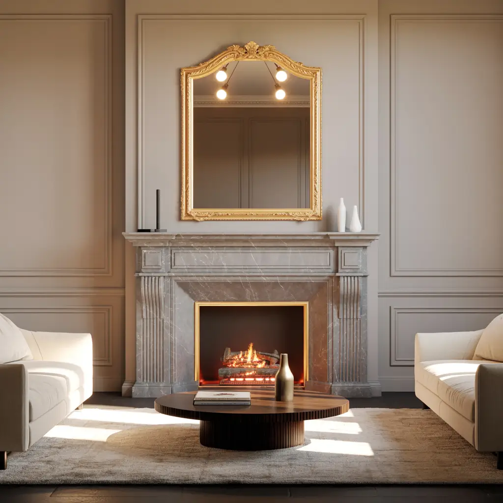 Neoclassical design respects negative space. Not every surface needs decoration. Empty walls between ornate mirrors let both elements breathe. Clear surfaces make decorative objects more impactful.
