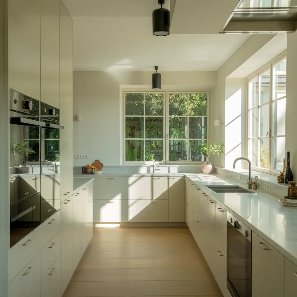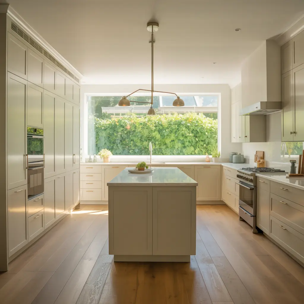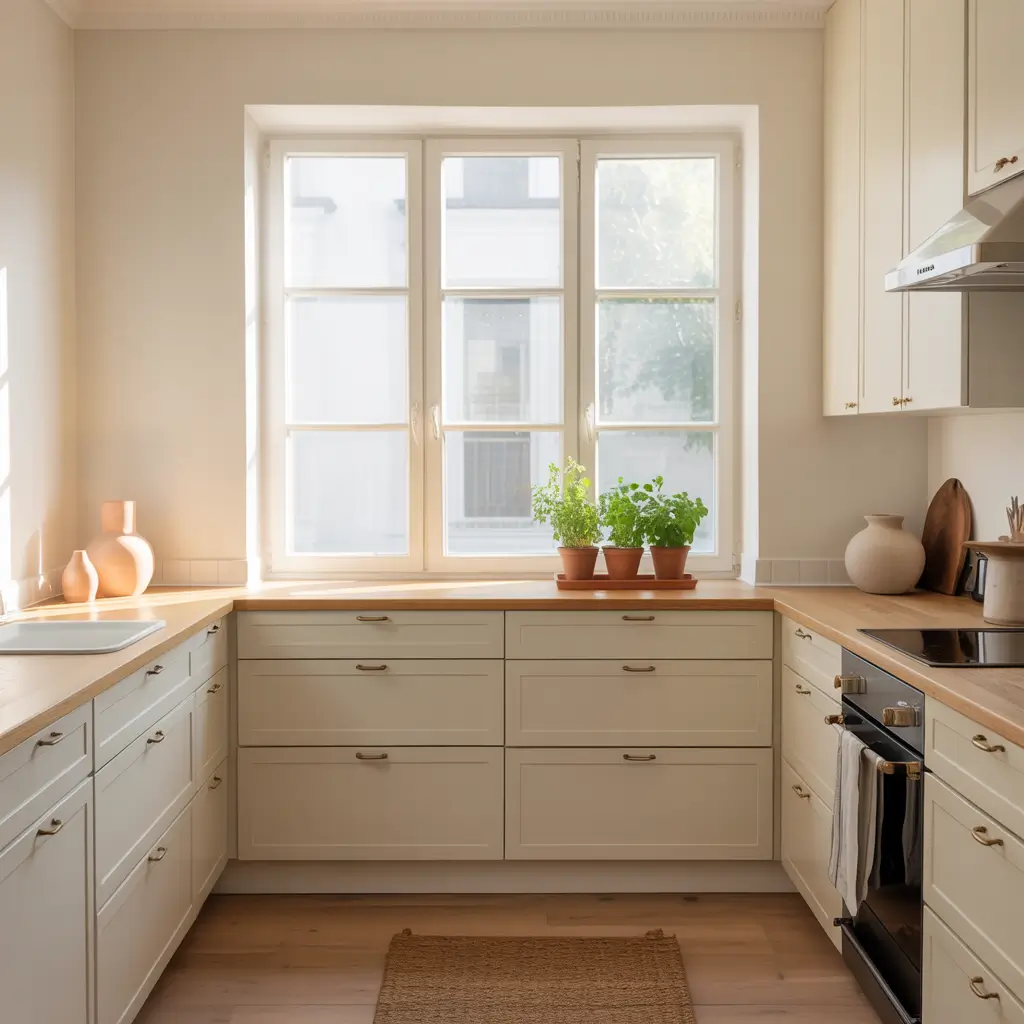 Want to amplify this effect? Consider glass cabinet doors or open shelving near windows. The light flows through, hits those off white surfaces, and creates this beautiful, diffused brightness that makes morning coffee feel like a spa experience.