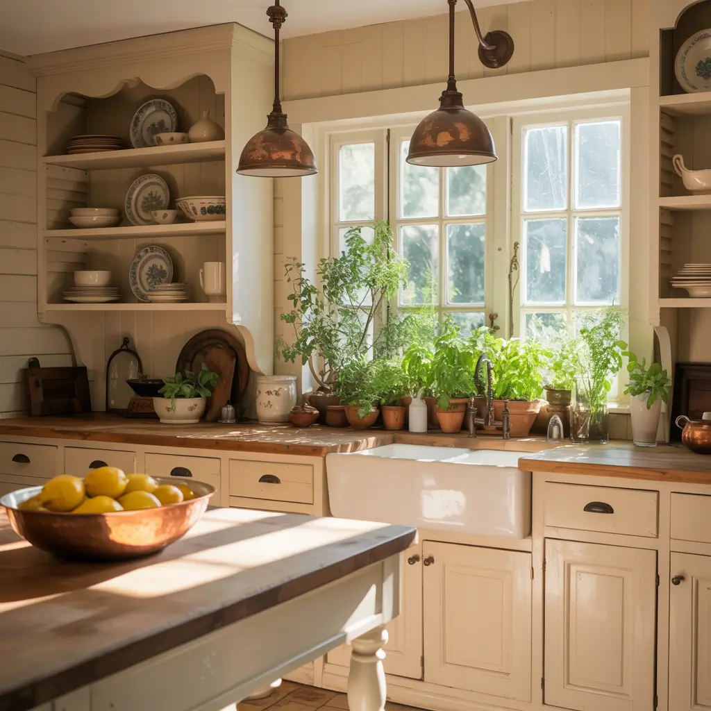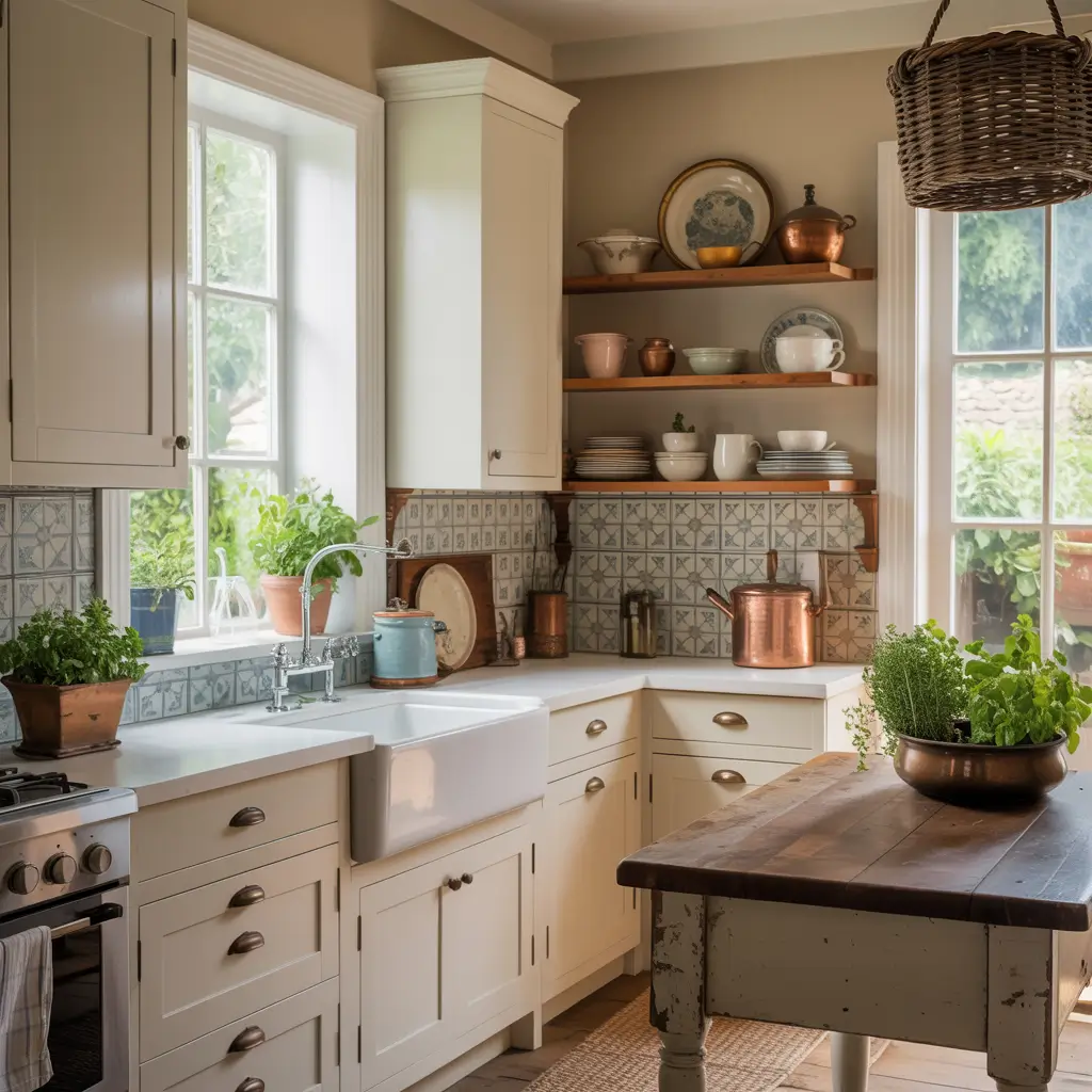What really sells the cottage look? Unfitted elements mixed with your off white cabinets. Maybe a vintage hutch painted to match, or a freestanding island in a complementary color. It’s about creating that perfectly imperfect vibe that makes cottage kitchens so charming.