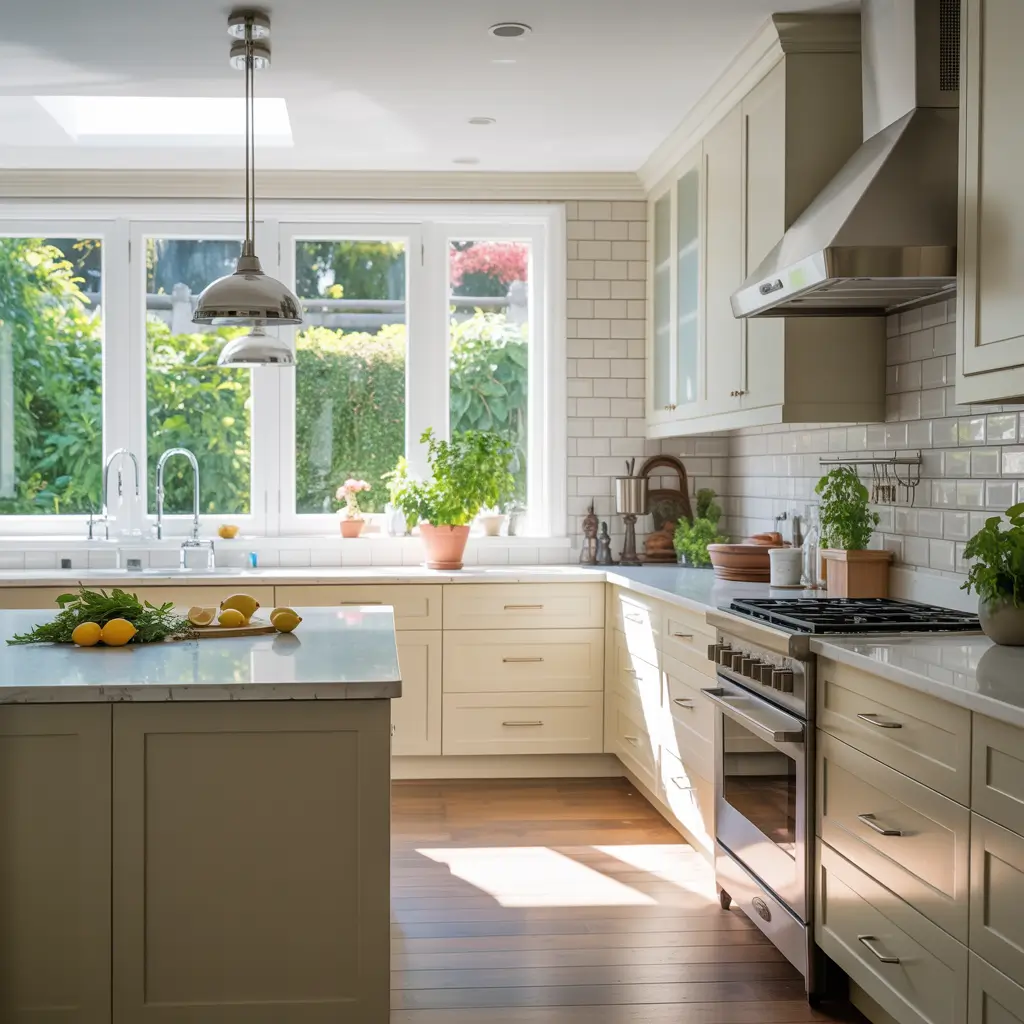 Ready for a plot twist in your kitchen? Two-tone designs featuring off white cabinets are absolutely killing it right now. Your perimeter cabinets stay off white, keeping things bright and spacious, while your island makes a statement in navy, forest green, or charcoal.