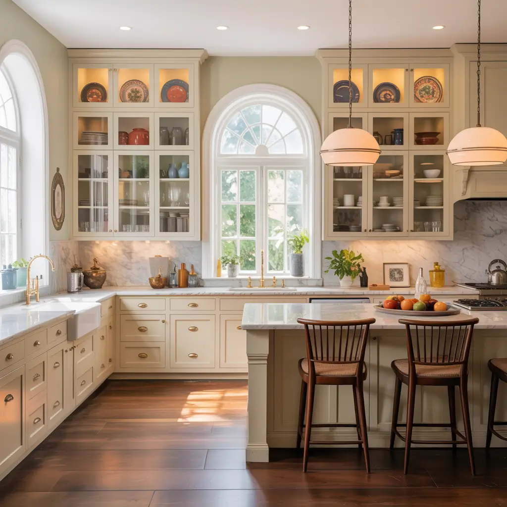Here’s a designer trick: light the interior of your glass-door cabinets. Those off white frames practically glow with interior lighting, creating ambiance and making your everyday dishes look like art pieces. IMO, it’s the easiest way to make your kitchen feel custom and high-end.