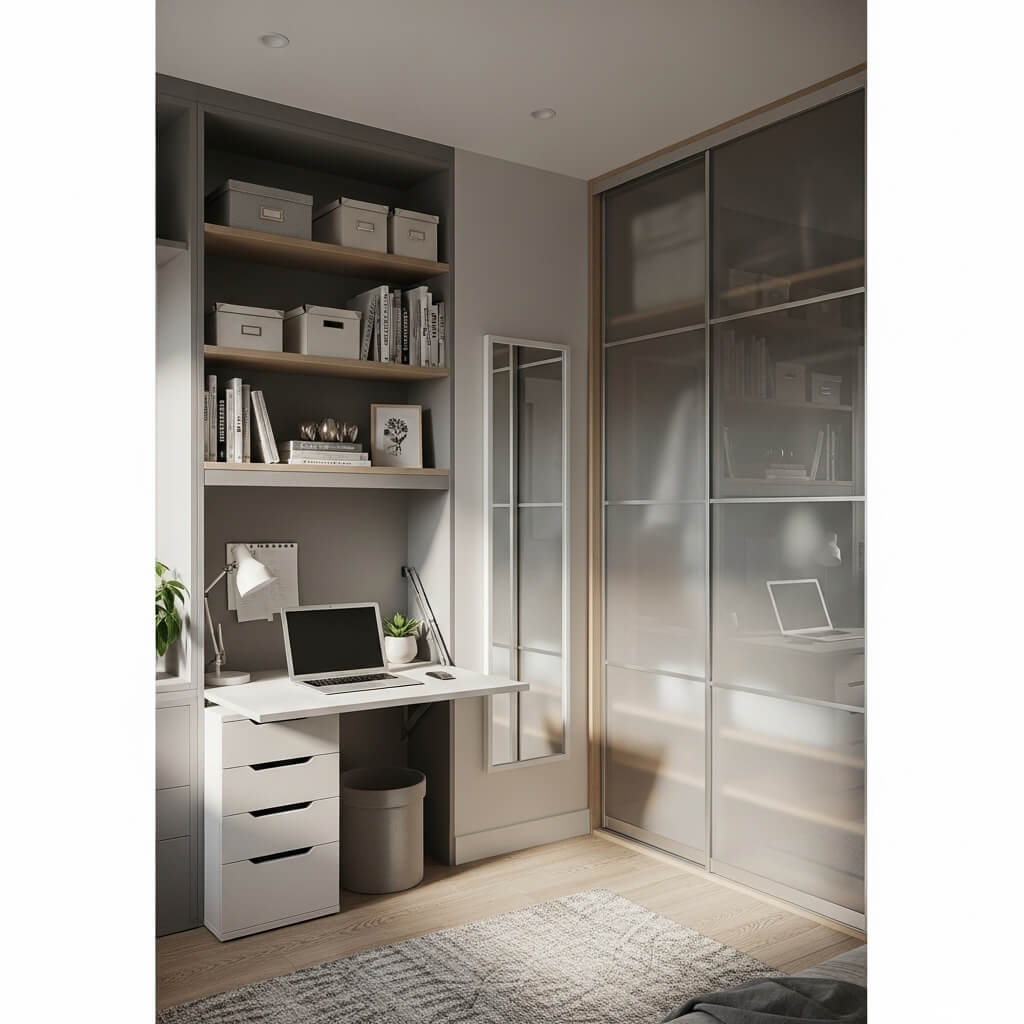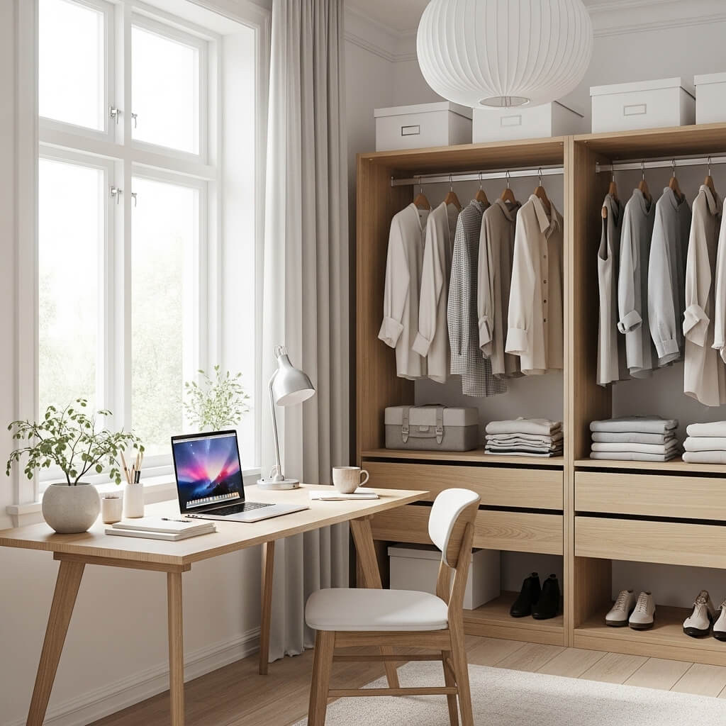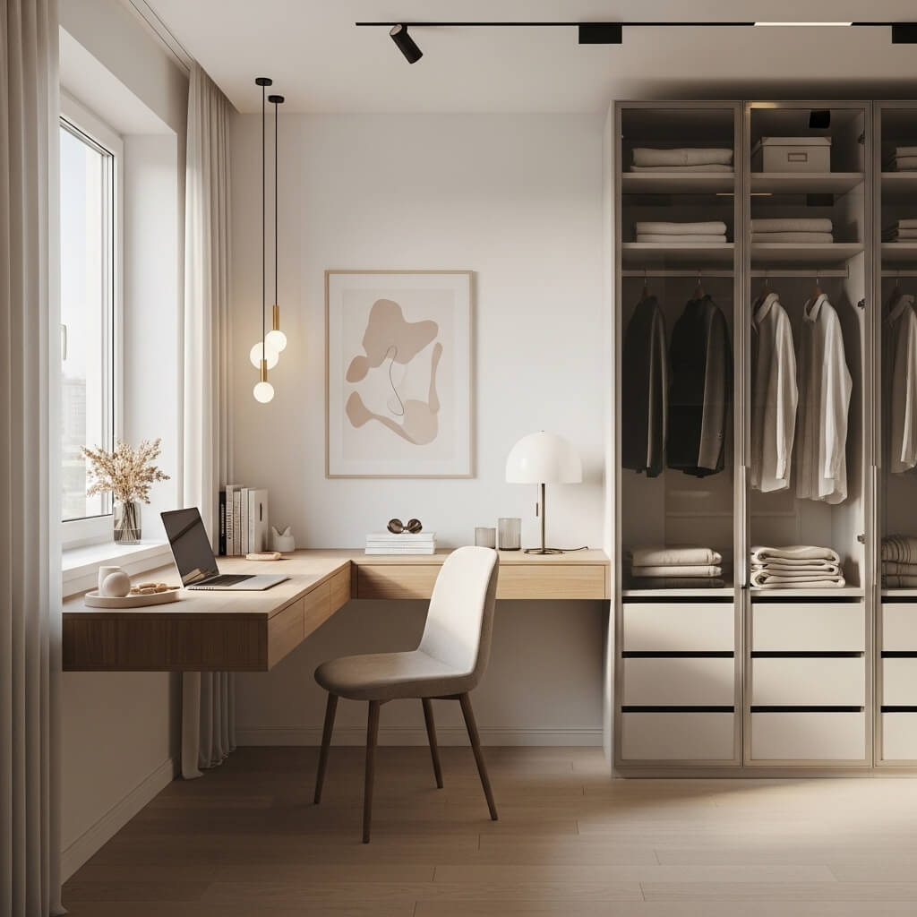 Living in a compact apartment with limited rooms means you get creative — fast. The compact apartment office dressing hybrid room is for anyone who has one multi-purpose room and needs it to perform at every hour of the day. Morning dressing routine? Check. Full workday at the desk? Check. Looking presentable on video calls without your closet visible in the background? Absolutely check.