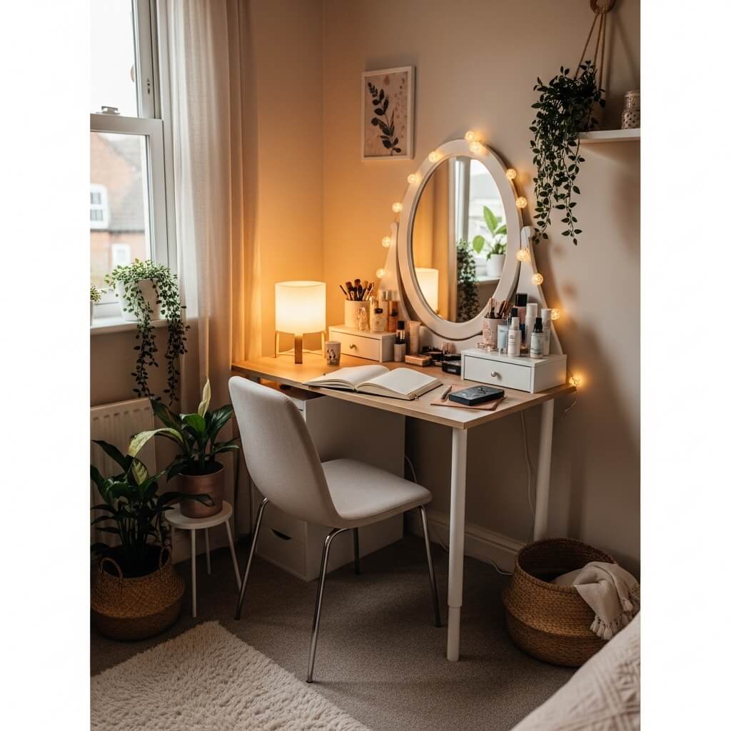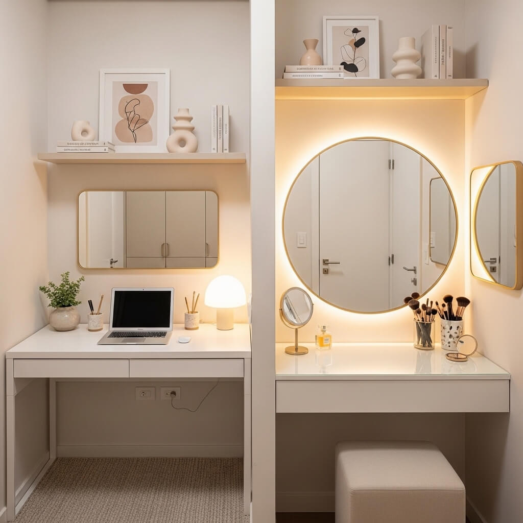 - Use different lighting setups for each zone — a bright task light for the desk, warm ambient lighting near the vanity