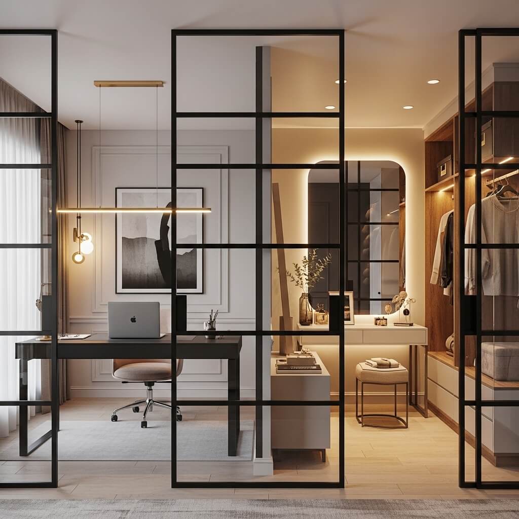 Glass dividers work best when you plan your electrical outlets and lighting independently for each zone. You’ll also want to think about your morning routine — if you’re someone who moves between zones frequently, make sure the transition is easy and unobstructed. A well-placed opening or sliding panel can solve this completely.