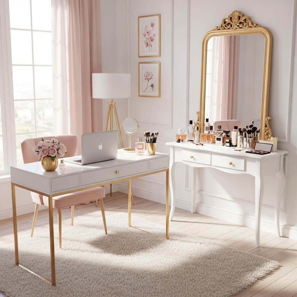 - Gold or rose gold hardware throughout — cabinet handles, mirror frames, desk accessories