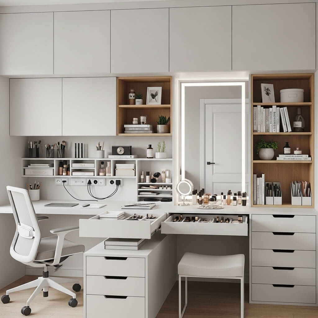 Here’s a truth that interior designers will back up completely: a well-organized space always looks better than a poorly organized one, regardless of how expensive the furniture is. The smart storage office and vanity combo takes this philosophy to its logical conclusion, building the entire room concept around exceptional storage design.