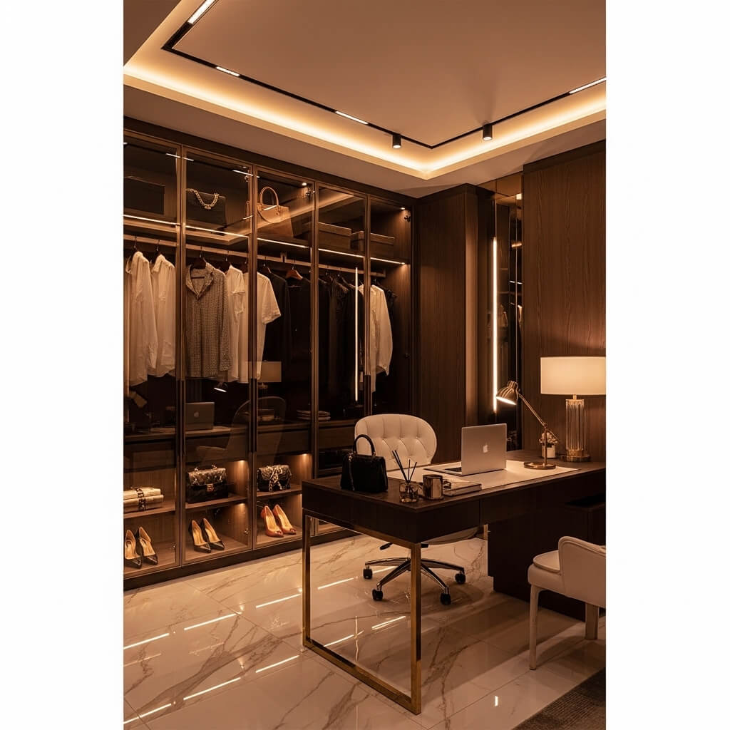If you have the square footage and you’re ready to invest in something truly spectacular, the luxury walk-in closet office fusion design is where interior design becomes an art form. This concept blends a fully fitted walk-in wardrobe with a dedicated, high-functioning home office — and the result is genuinely breathtaking.