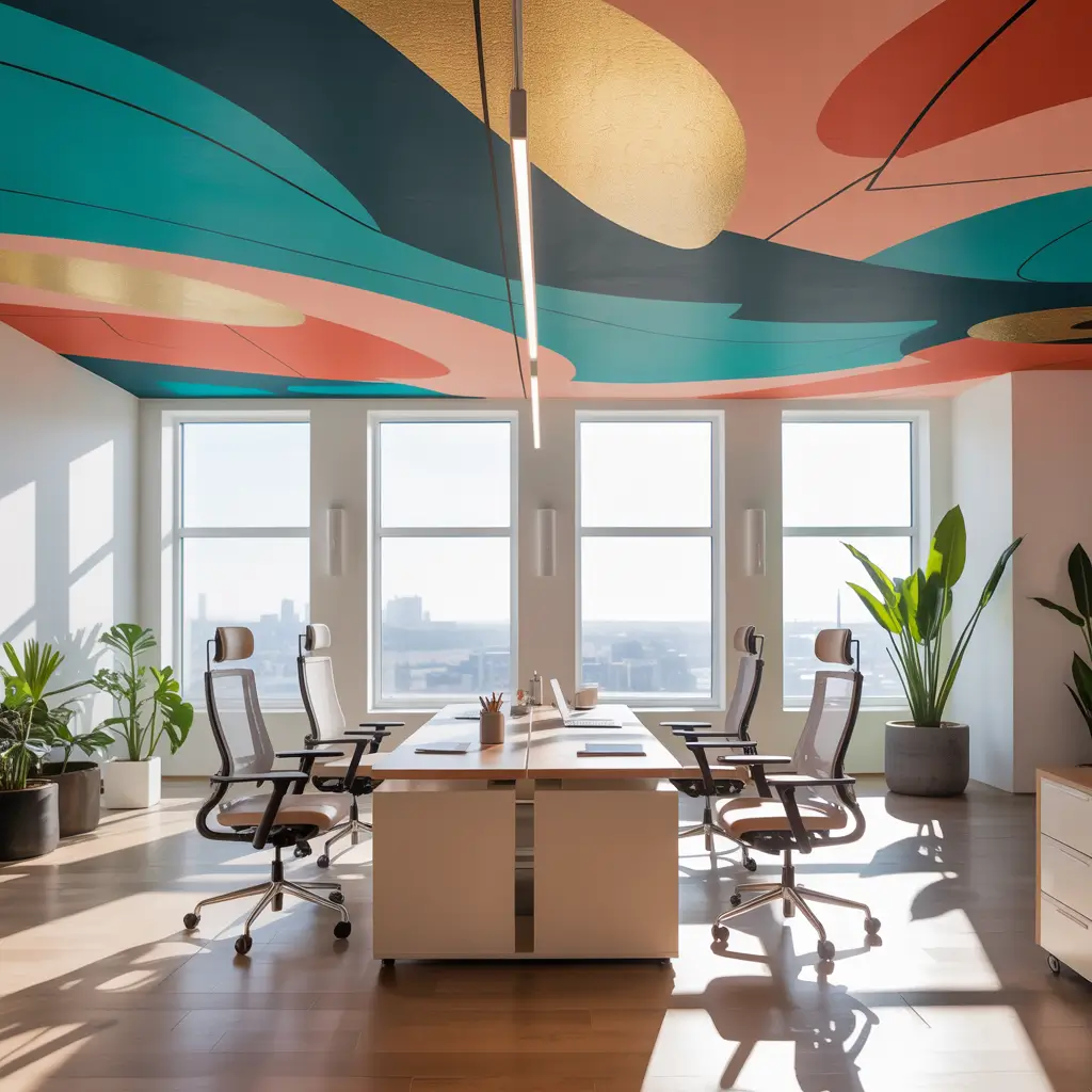 Modern ceiling murals go way beyond clouds though. Abstract patterns, geometric designs, or even company-culture-inspired artwork can turn your ceiling into a conversation piece that reinforces your brand identity.