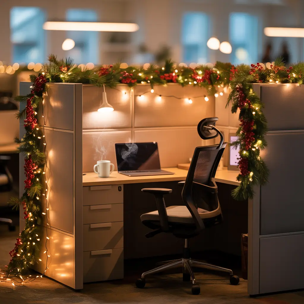Cubicle walls are basically begging for garland. They’re the perfect canvas for festive draping without damaging company property or violating that 47-page employee handbook nobody actually reads.
