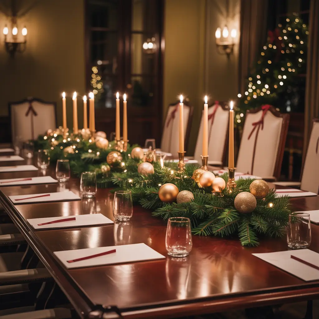 Start with the centerpiece – a low-profile arrangement that won’t block sightlines during presentations. Add subtle touches like holiday table runners or battery-operated candles. Swap regular notepads for ones with festive borders. Small changes, big impact.