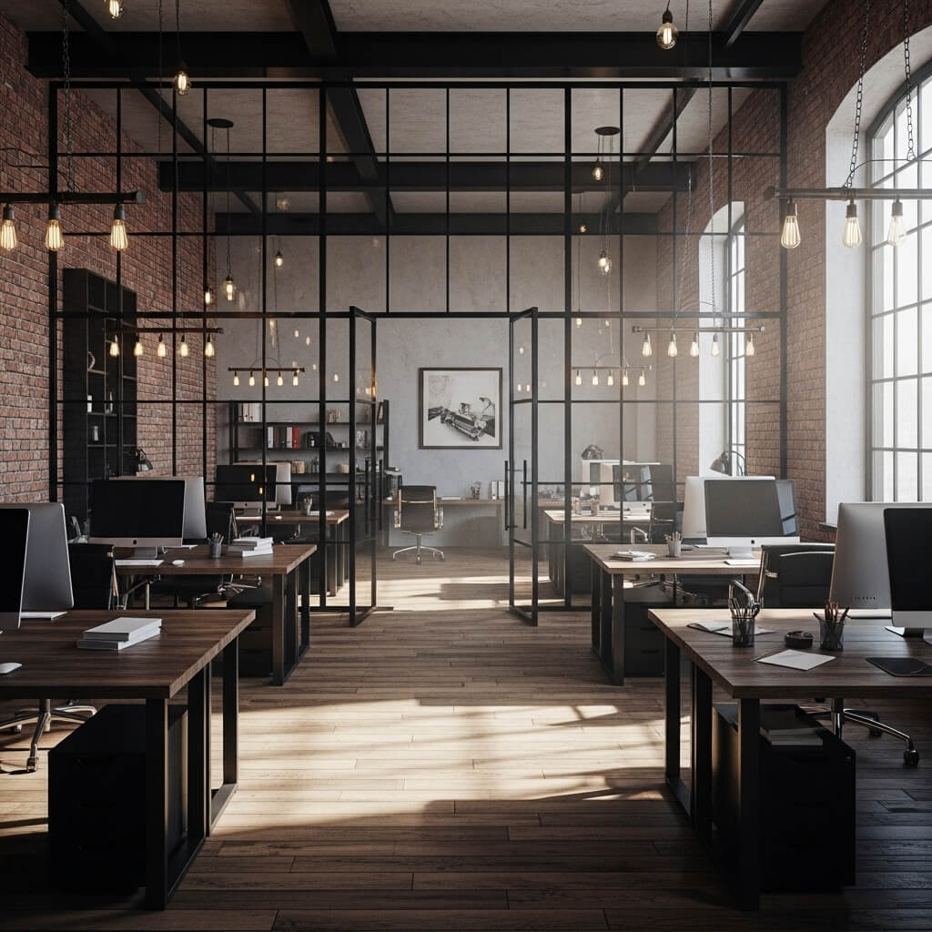 Industrial-style partitions bring a sophisticated, loft-like feeling to office spaces. They work particularly well in converted warehouse spaces or modern buildings with exposed structure and industrial materials. The metal frames provide visual weight and structure that complements concrete floors and exposed ceilings.